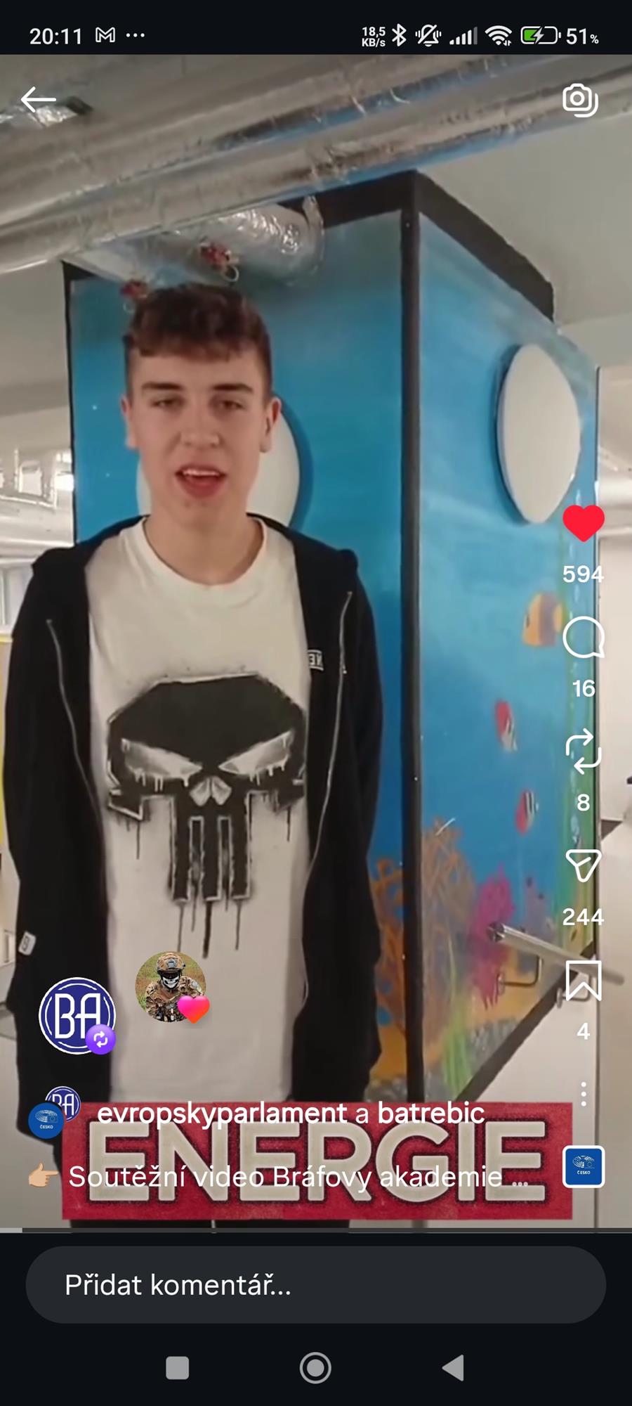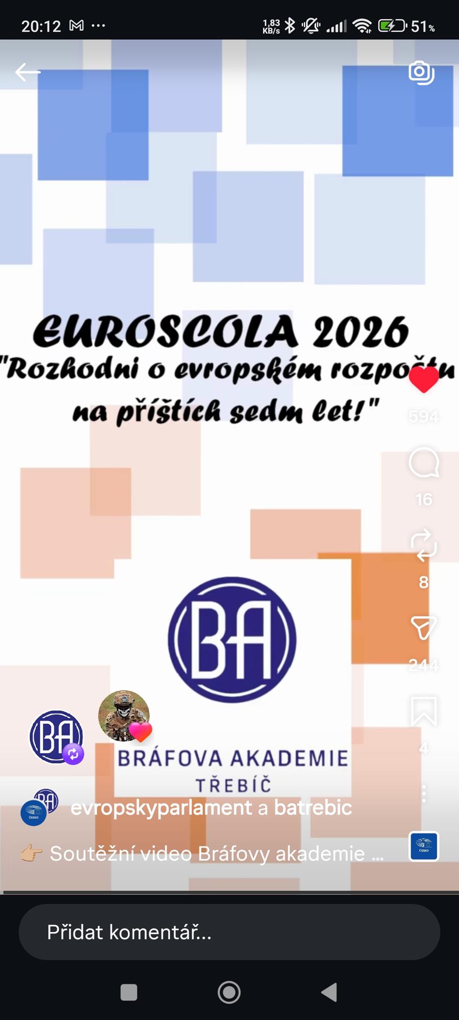 moc Vám děkujeme za zaslané soutěžní video do soutěže Euroscola 2026. S potěšením Vám oznamujeme, že Vaše video postoupilo do finále! Od dnešního dne za něj může veřejnost hlasovat na instagramovém účtu Kanceláře Evropského parlamentu v ČR: @evropskyparlament . Na tomto účtu nyní probíhá soutěž o počet lajků („to se mi líbí“) u jednotlivých soutěžních příspěvků.Hlasování veřejnosti bude ukončeno 5. ledna 2026 ve 12:00."