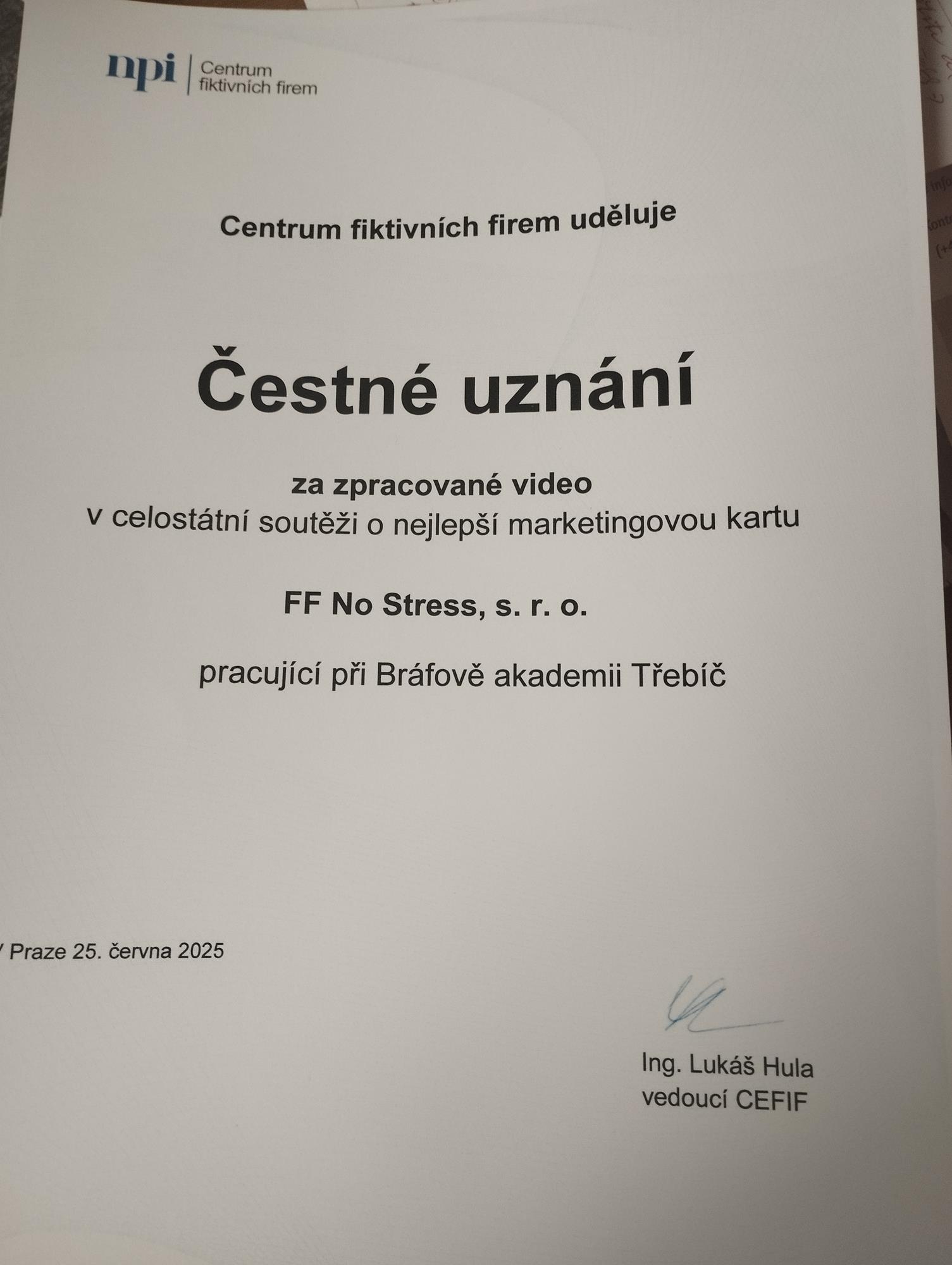 Marketingové oddělení : Celkově jsme vytvořili 12 letáků, některé z nich v anglickém jazyce. Vytvořili jsme také firemní logo, grafiku sloganu firmy, vizitky a visačky a marketingovou kartu a videa. Jirka pracoval na katalogu cestovní kanceláře a je rovněž autorem marketingové karty. Většinu práce, která se týkala základní marketingové propagace udělal on. Vendula pomáhala s obrázky do katalogu a měla na starosti třídění složek marketingového oddělení. Lukáš má dobré dovednosti v grafickém editoru Canva, takže vytvořil většinu letáků. Letáky byly opravdu hezky zpracované. S prací cestovní kanceláře No Stress jsme byli spokojení. Získali jsme spoustu zkušeností a v budoucnu si třeba nějakou tu cestovní kancelář sami založíme.