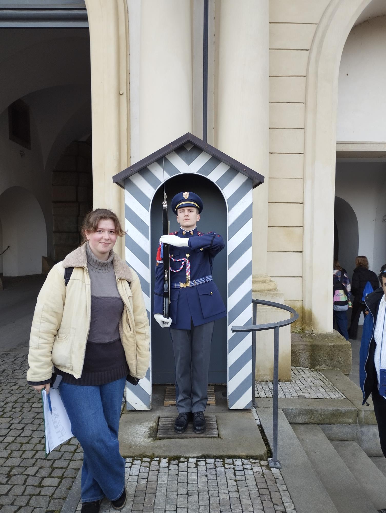 Prvním bodem se stal Pražský hrad, kde jsme absolvovali krásnou prohlídku se zkušenými průvodci, od kterých jsme mohli čerpat zkušenosti v oblasti přednesu a chování k návštěvníkům. Prohlédli jsme si úchvatné prostory katedrály svatého Víta a mohli se kochat kaplí svatého Václava, v jejíž prostorách se nacházejí dveře ke slavné Korunní komoře, ve které jsou uloženy korunovační klenoty zamčené pomocí 7 klíčů. Navštívili jsme také Vladislavský sál, kde se předávají státní vyznamenání, a viděli jsme repliky korunovačních klenotů. Po ukončení prohlídky jsme si ještě prošli Zlatou uličku a při odchodu z Hradu jsme zažili polední střídání stráží za doprovodu krásné hudby.